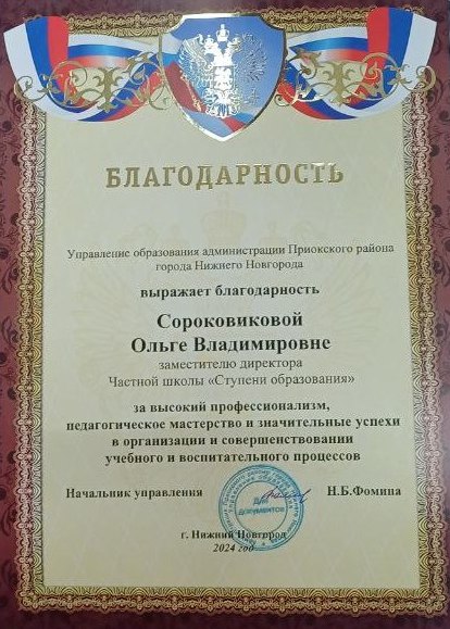 2024 Награждена благодарностью управления образования администрации Приокского района города Нижнего Новгорода «за высокий профессионализм, педагогическое мастерство и значительные успехи в организации и совершенствовании учебного и воспитательного процессов»