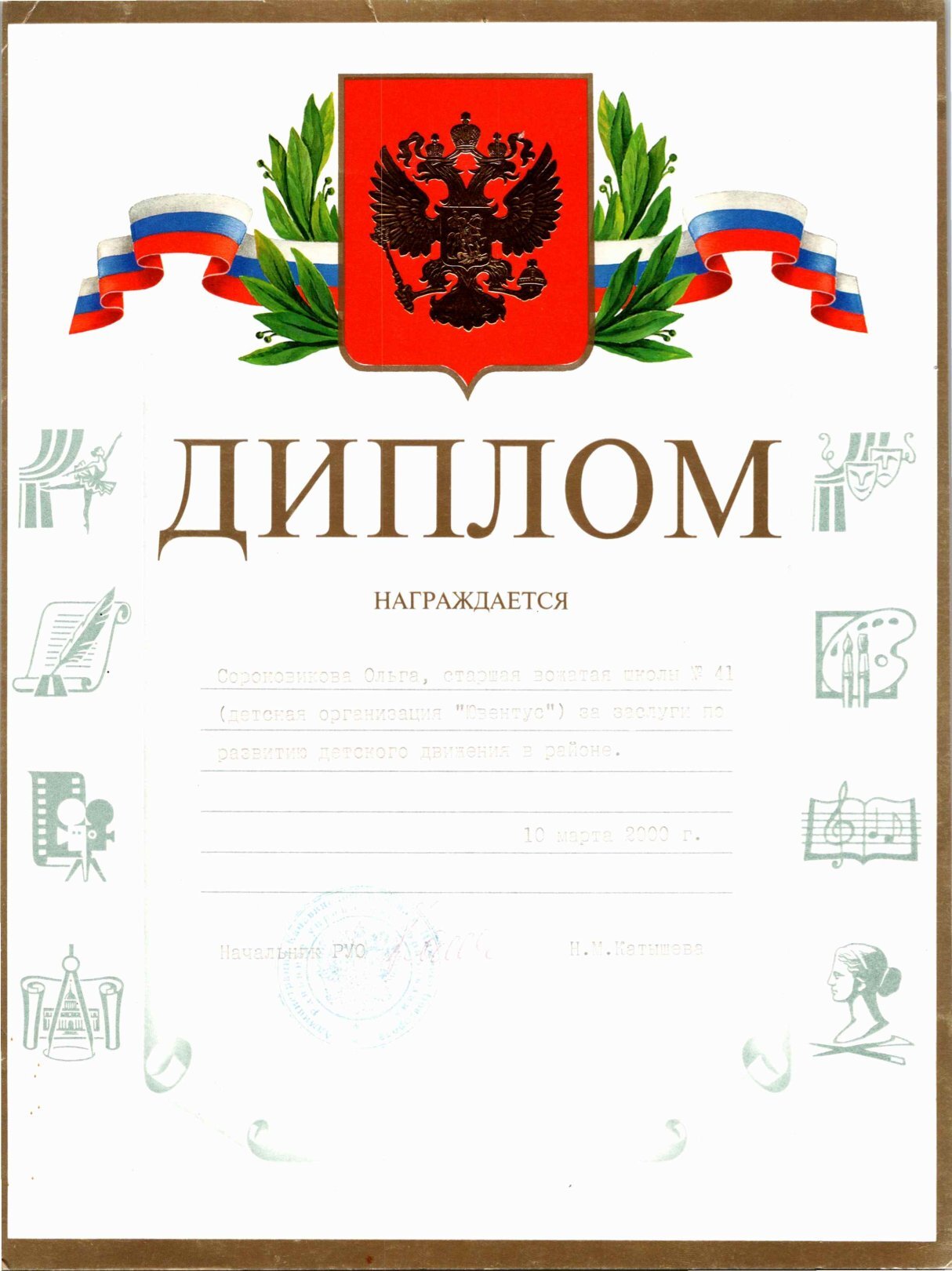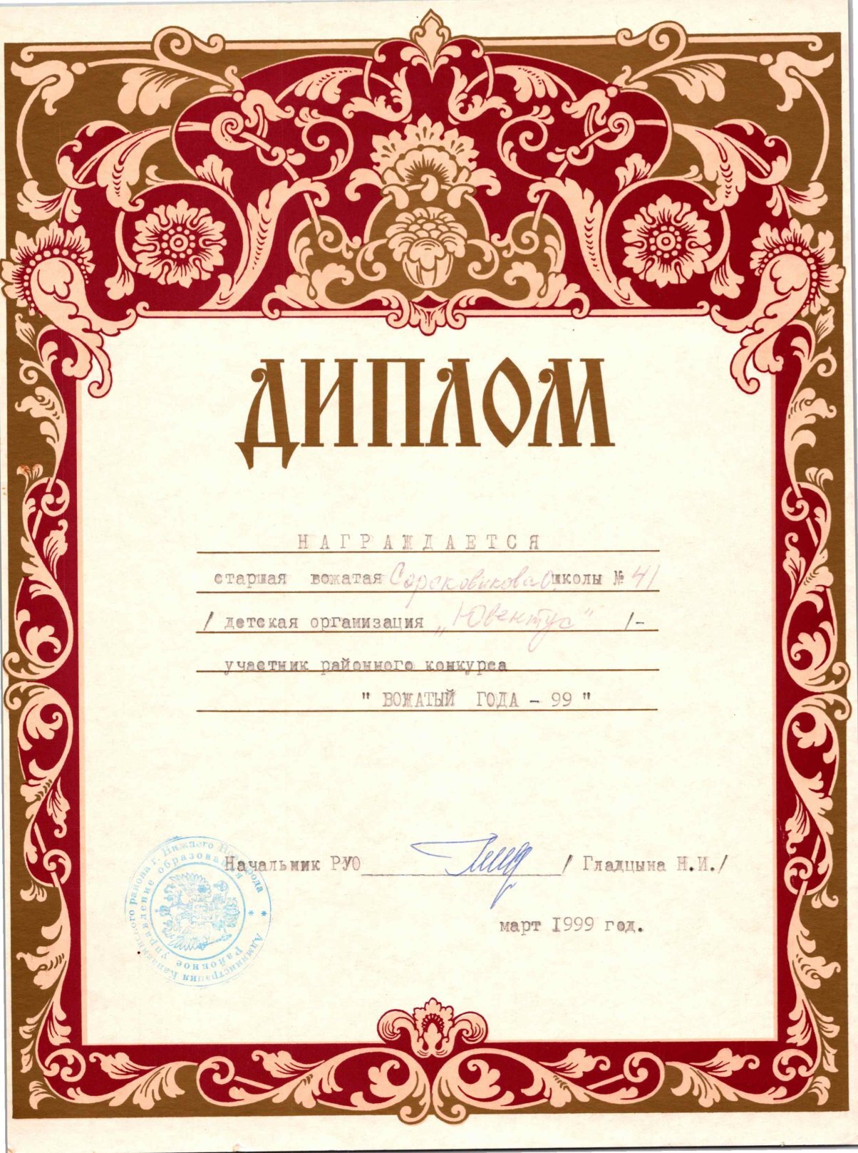 2000 Награждена дипломом управления образования администрации Канавинского района г. Нижнего Новгорода «за участие в районном конкурсе «Вожатый года – 99»
