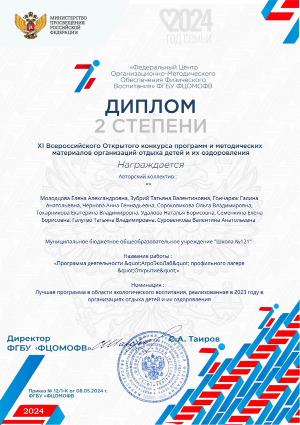 победитель Всероссийского конкурса методических разработок по патриотическому воспитанию детей и молодёжи в условиях организации отдыха детей и их оздоровления, посвящённому 80-й годовщине Победы в Великой Отечественной войне 1941-1945 годов