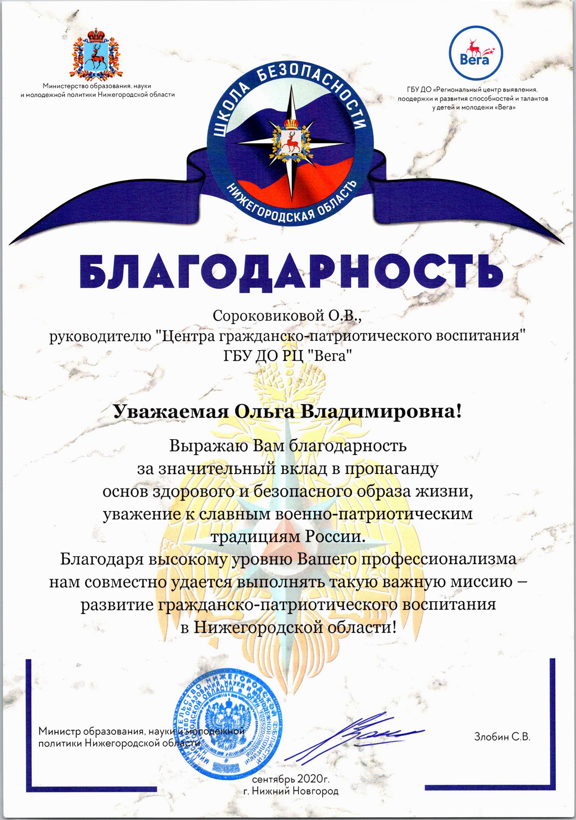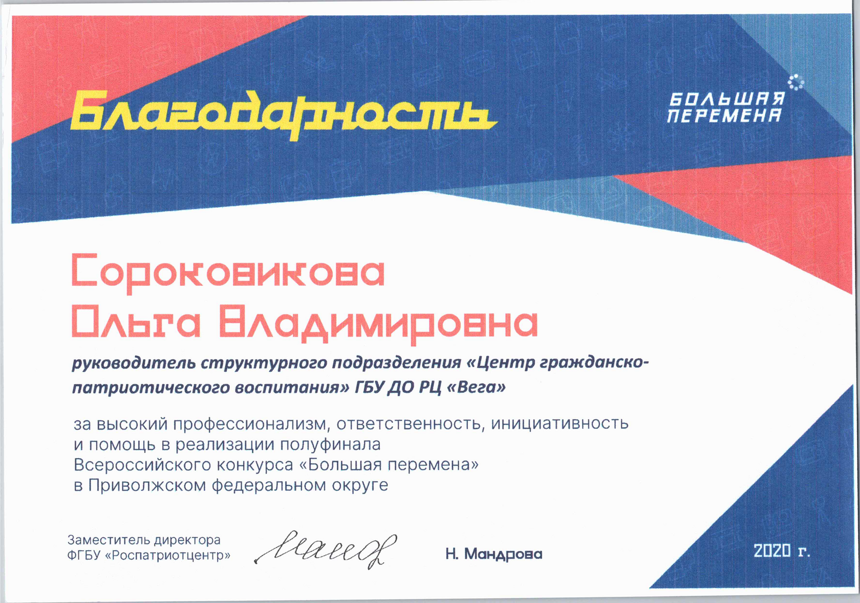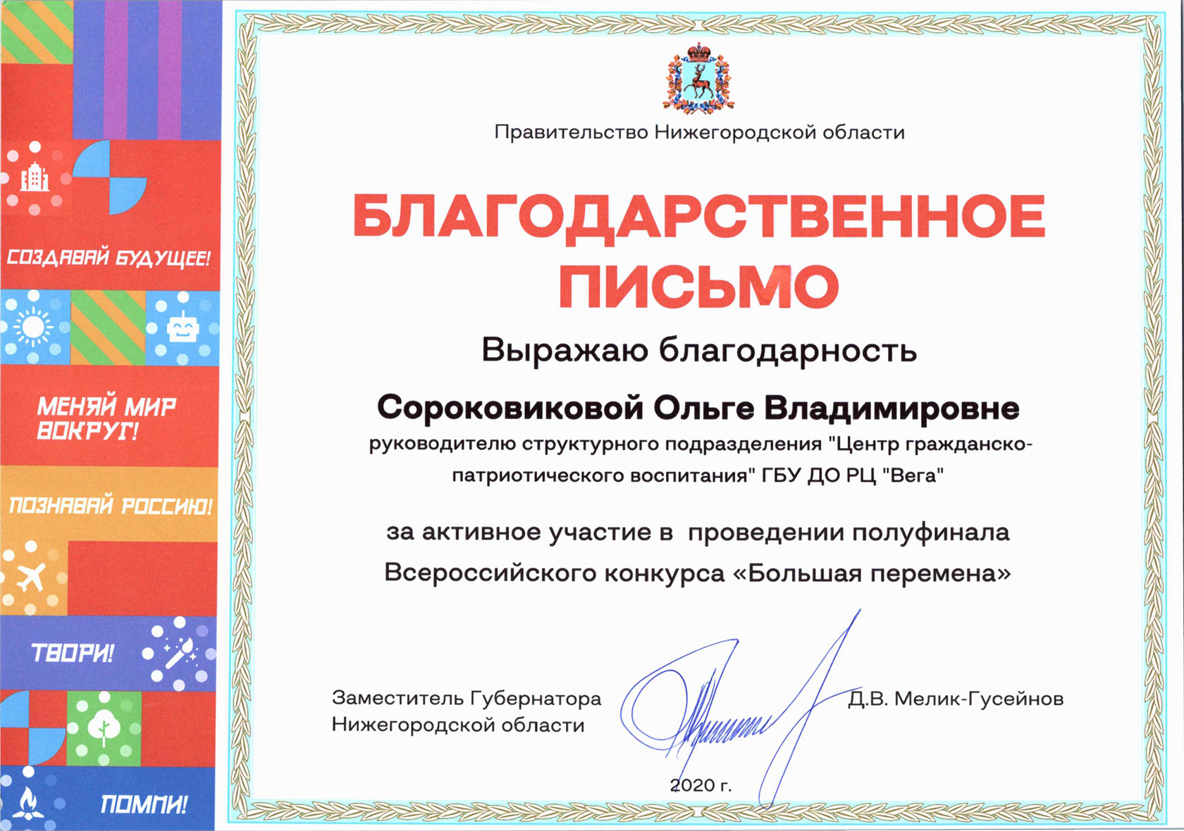 2020 Награждена благодарственным письмом Правительства Нижегородской области «за активное участие в проведении полуфинала Всероссийского конкурса «Большая перемена»
