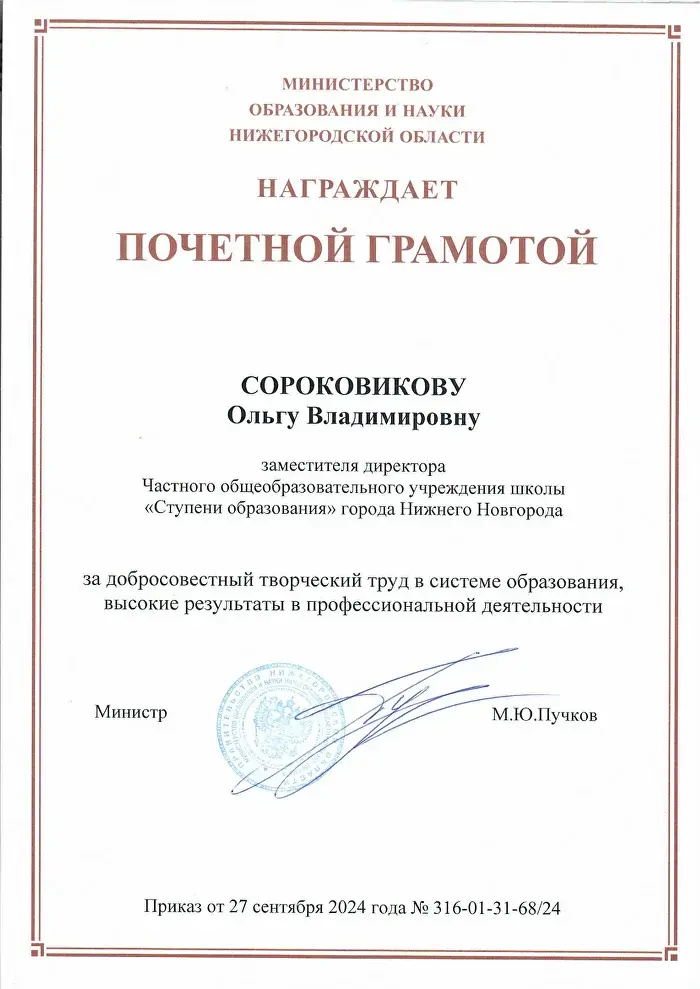 2024 Награждена Почетной грамотой Министерства образования и науки Нижегородской области «за добросовестный творческий труд в системе образования, высокие результаты в профессиональной деятельности»