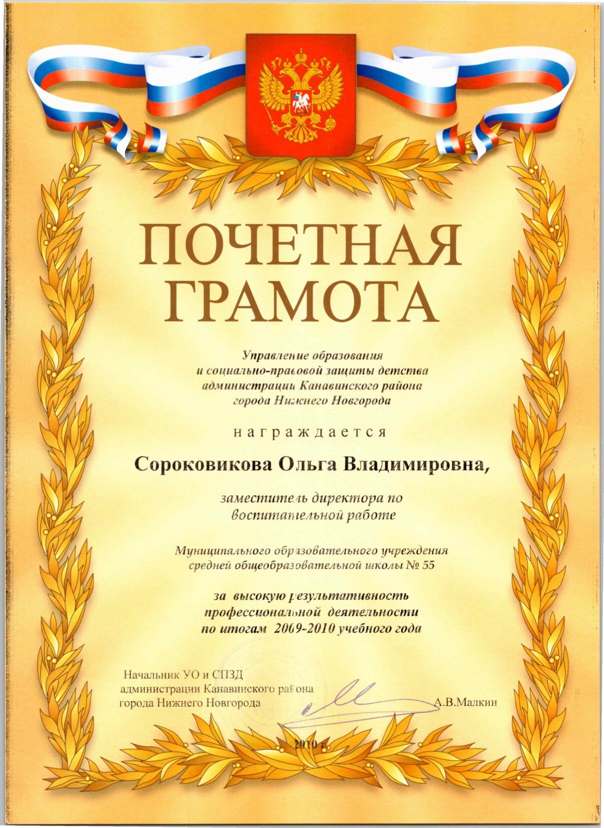 2010 Награждена почётной грамотой управления образования и социально-правовой защиты детства администрации Канавинского района города Нижнего Новгорода «за высокую результативность профессиональной деятельности по итогам 2009-2010 учебного года»