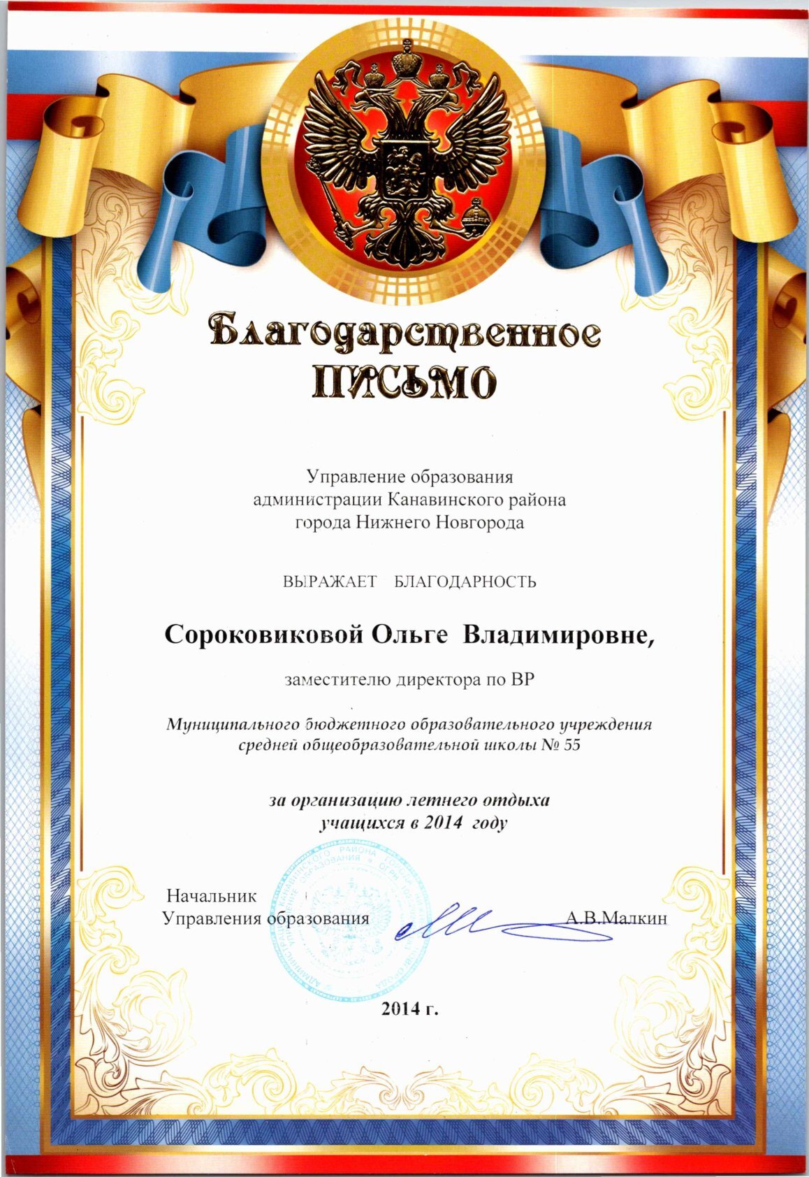 2014 Награждена благодарственным письмом управления образования Канавинского района города Нижнего Новгорода «за организацию летнего отдыха учащихся в 2014 году»