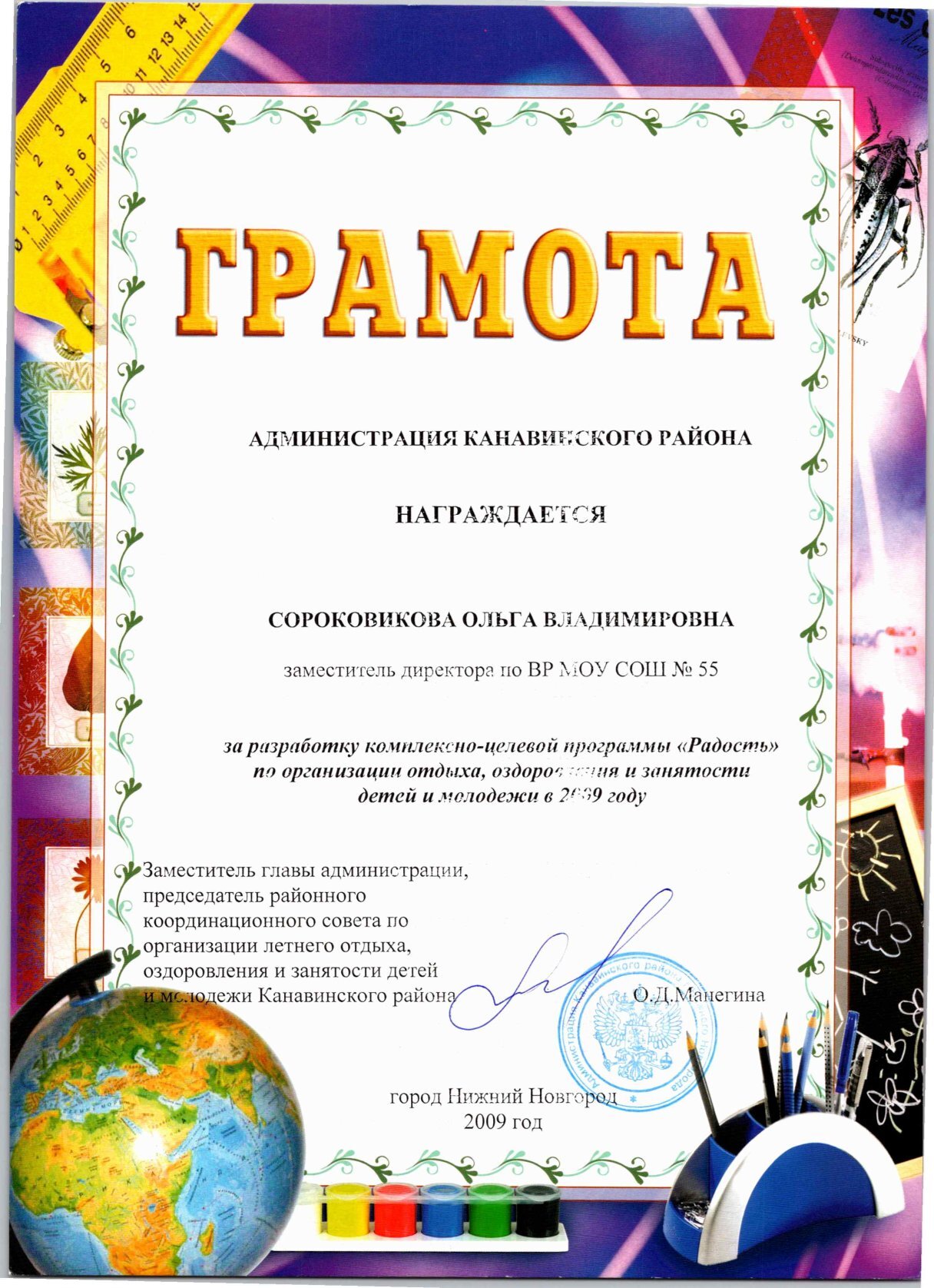 2009 Награждена грамотой администрации Канавинского района города Нижнего Новгорода «за разработку комплексно-целевой программы «Радость» по организации отдыха, оздоровления и занятости детей и молодёжи в 2009 году»