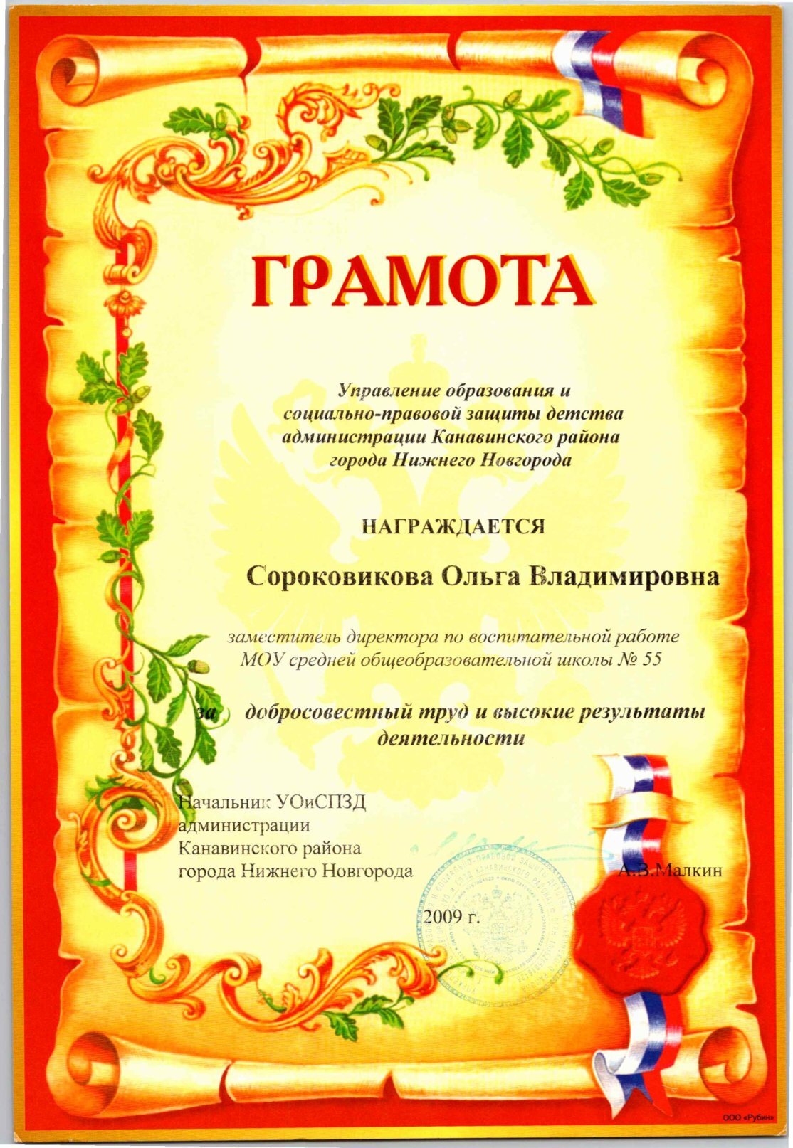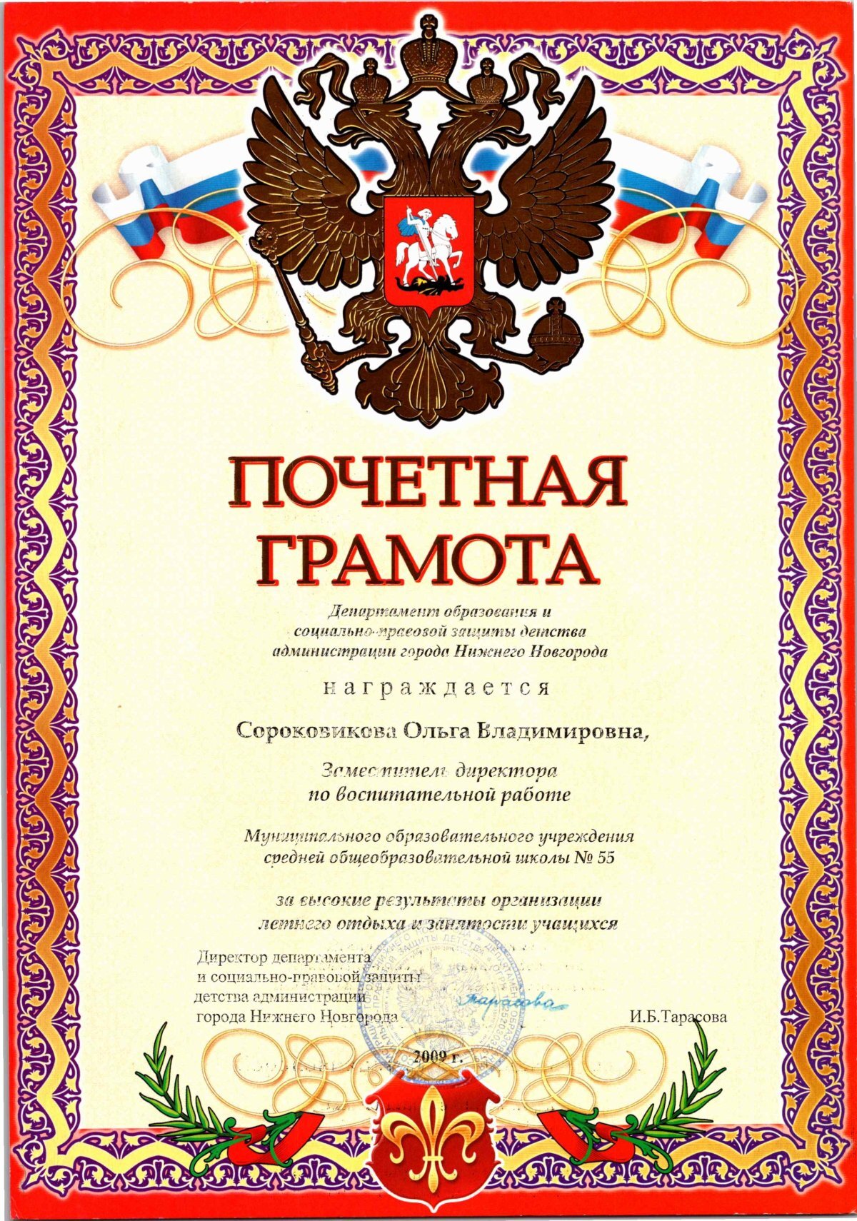 2009 Награждена почётной грамотой департамента образования и социально-правовой защиты детства администрации города Нижнего Новгорода «за высокие результаты организации летнего отдыха и занятости учащихся»