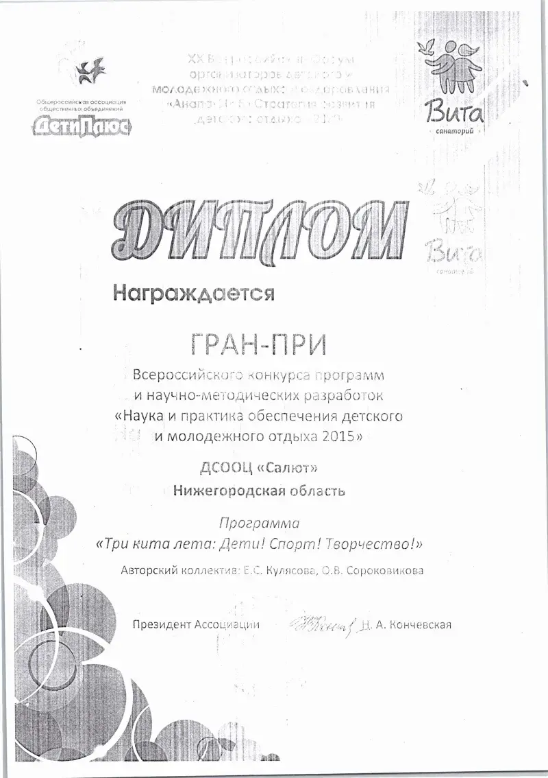 ГРАН-ПРИ Всероссийского конкурса программ и научно-методических разработок «Наука и практика обеспечения детского и молодежного отдыха 2015