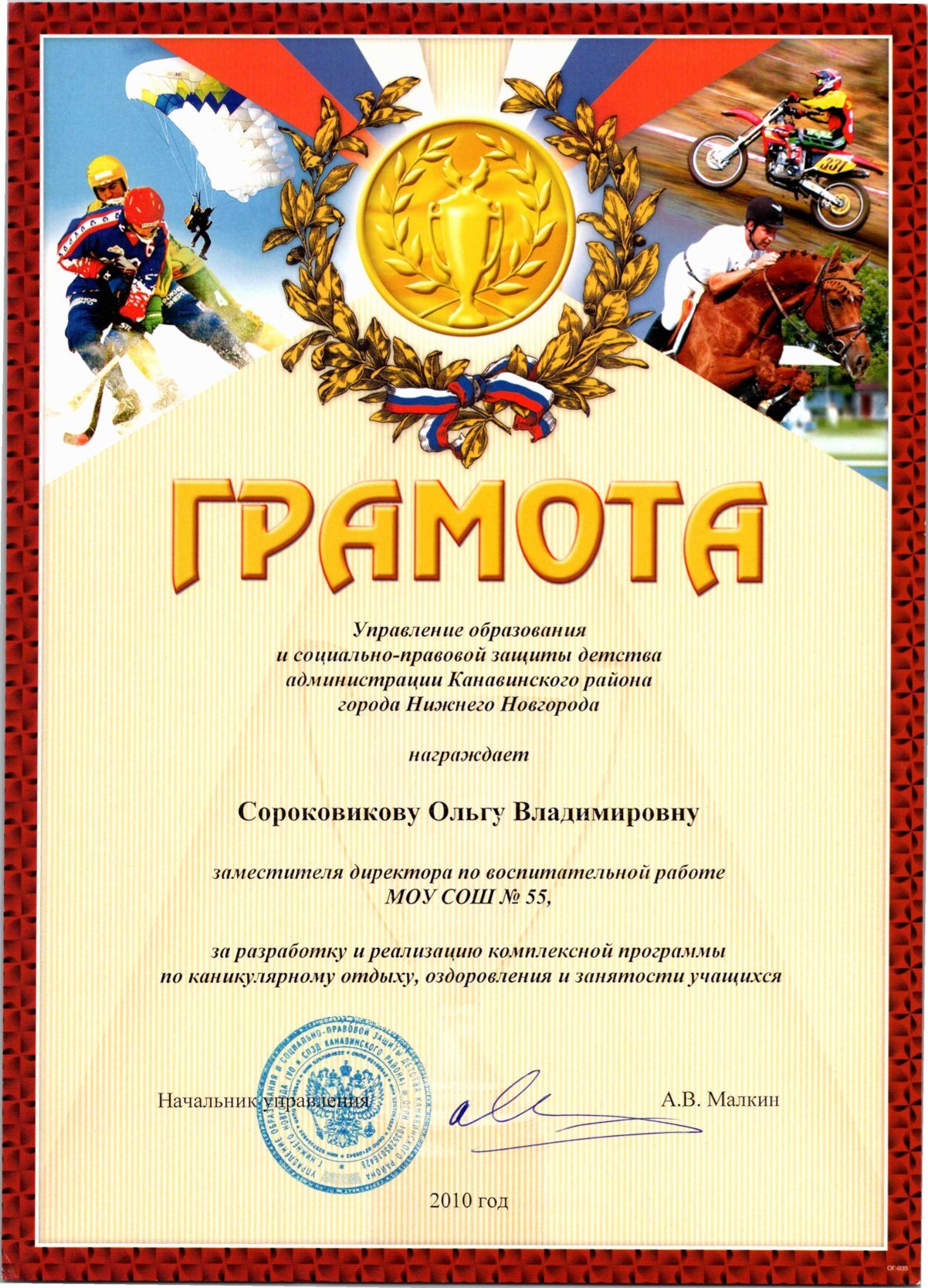 2010 Награждена грамотой управления образования и социально-правовой защиты детства администрации Канавинского района города Нижнего Новгорода «за разработку и реализацию комплексной программы по каникулярному отдыху, оздоровления и занятости учащихся»