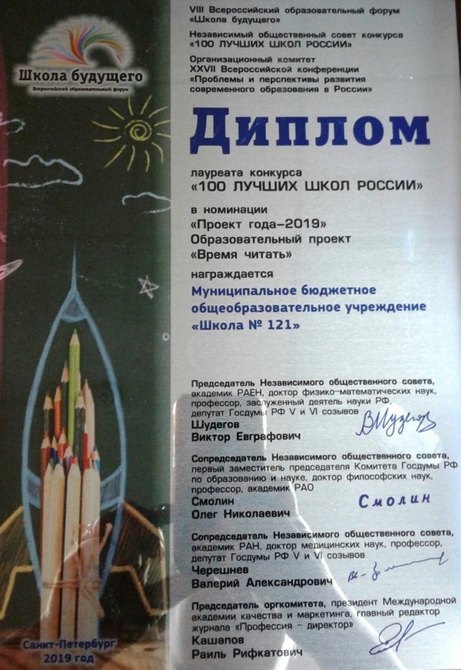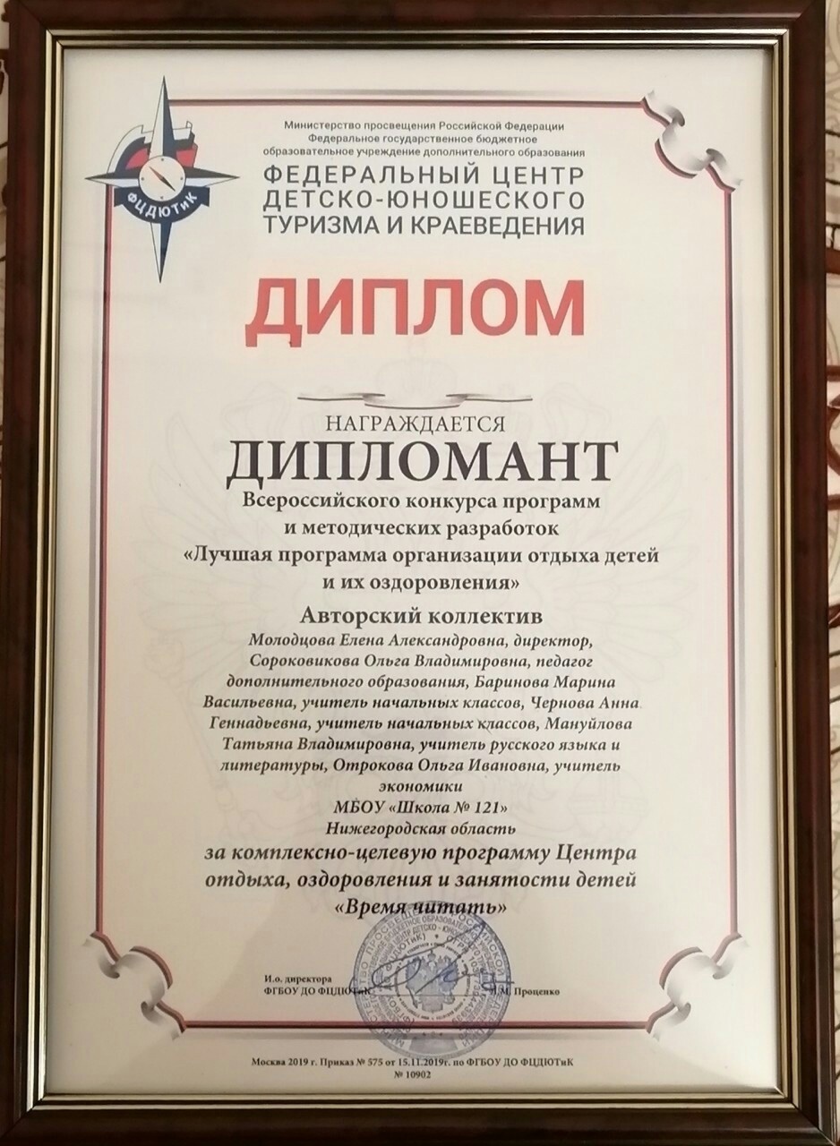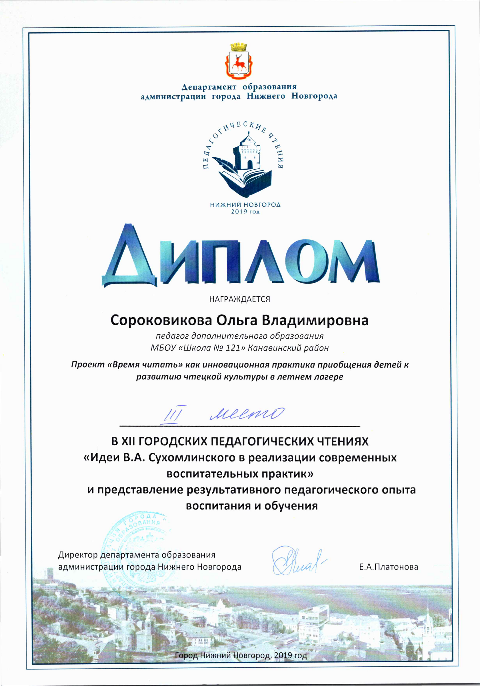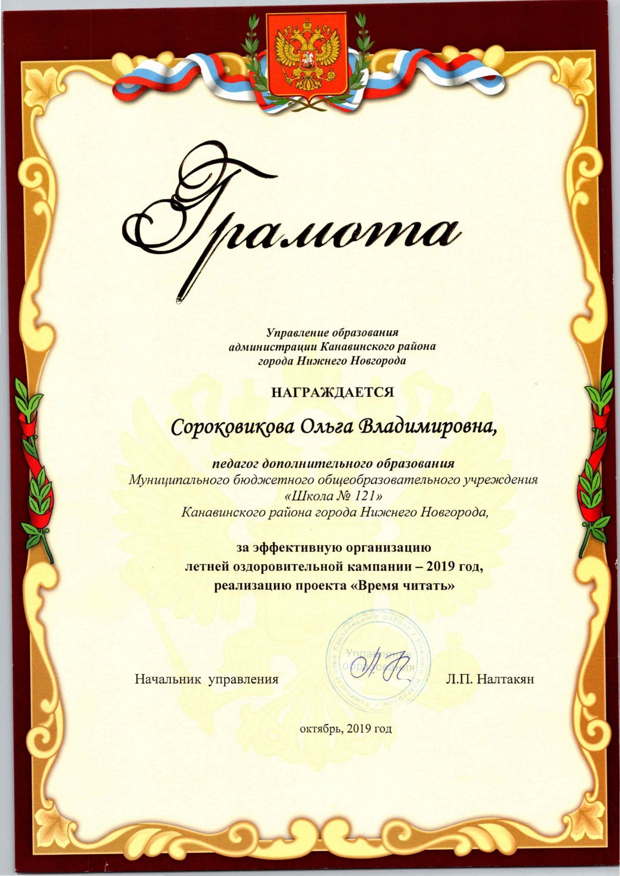 2019 Награждена грамотой управления образования Канавинского района города Нижнего Новгорода «за эффективную организацию летней оздоровительной кампании – 2019 год, реализацию проекта «Время читать»
