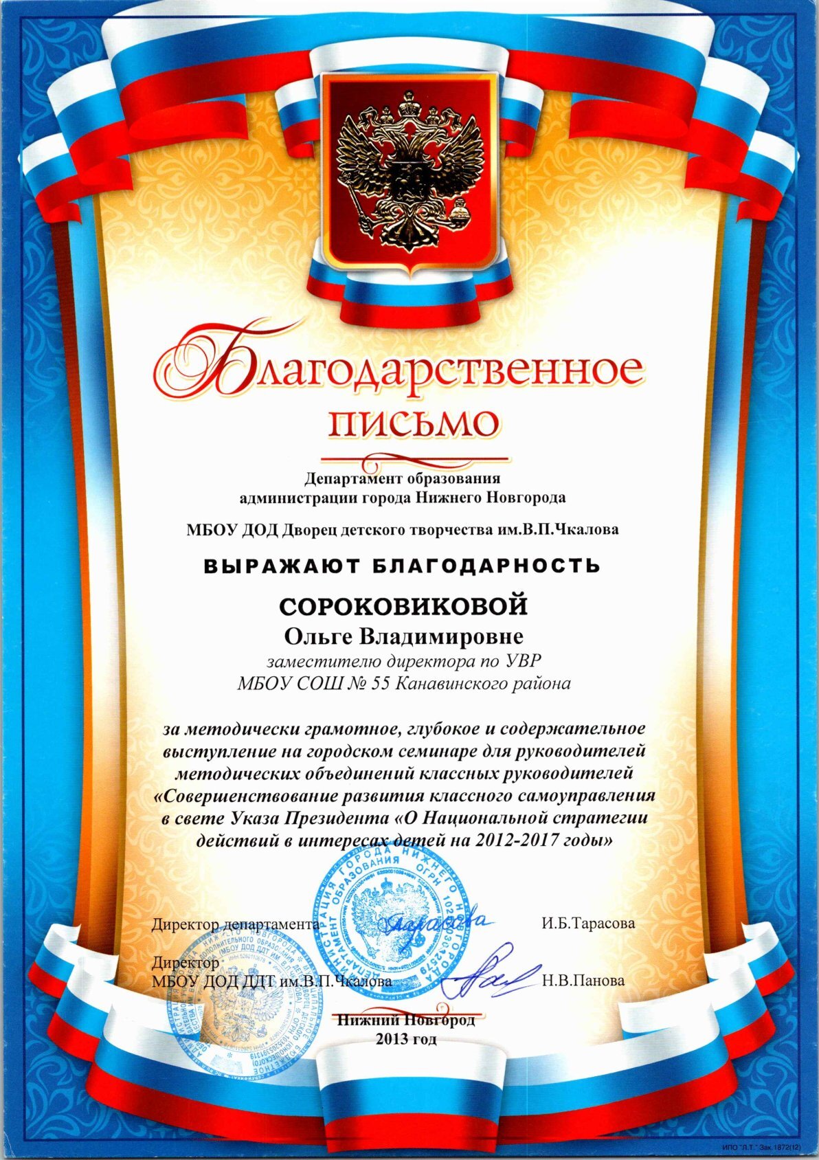 2013 Награждена благодарностью департамента образования администрации города Нижнего Новгорода и МБОУ ДОД ДДТ им. В.П. Чкалова «за методически грамотное, глубокое и содержательное выступление на городском семинаре для руководителей методических объединений классных руководителей «Совершенствование развития классного самоуправления в свете Указа Президента «О национальной стратегии действий в интересах детей на 2012-2017 годы»