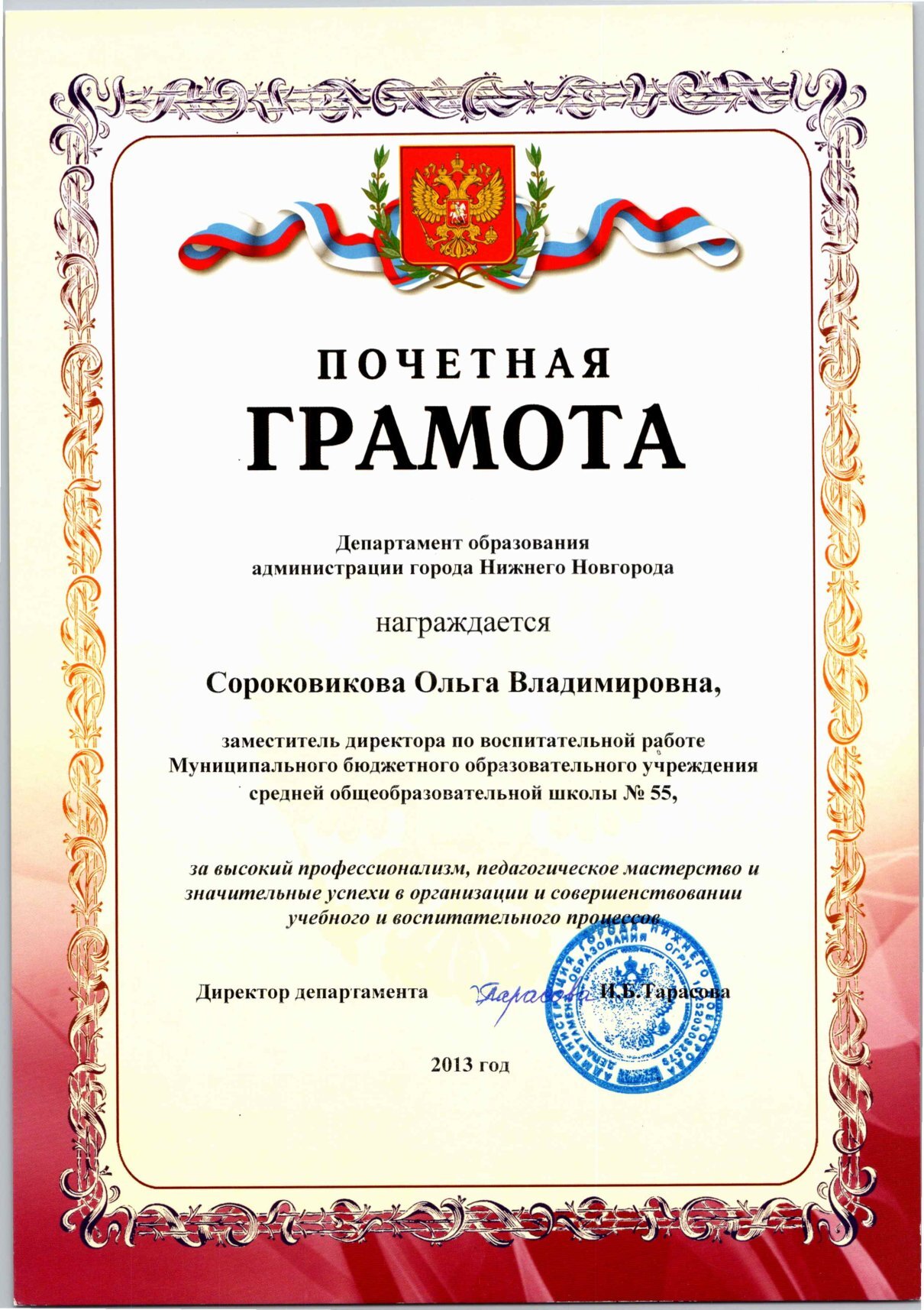2013 Награждена почётной грамотой департамента образования администрации города Нижнего Новгорода «за высокий профессионализм, педагогическое мастерство и значительные успехи в организации и совершенствовании учебного и воспитательного процессов»