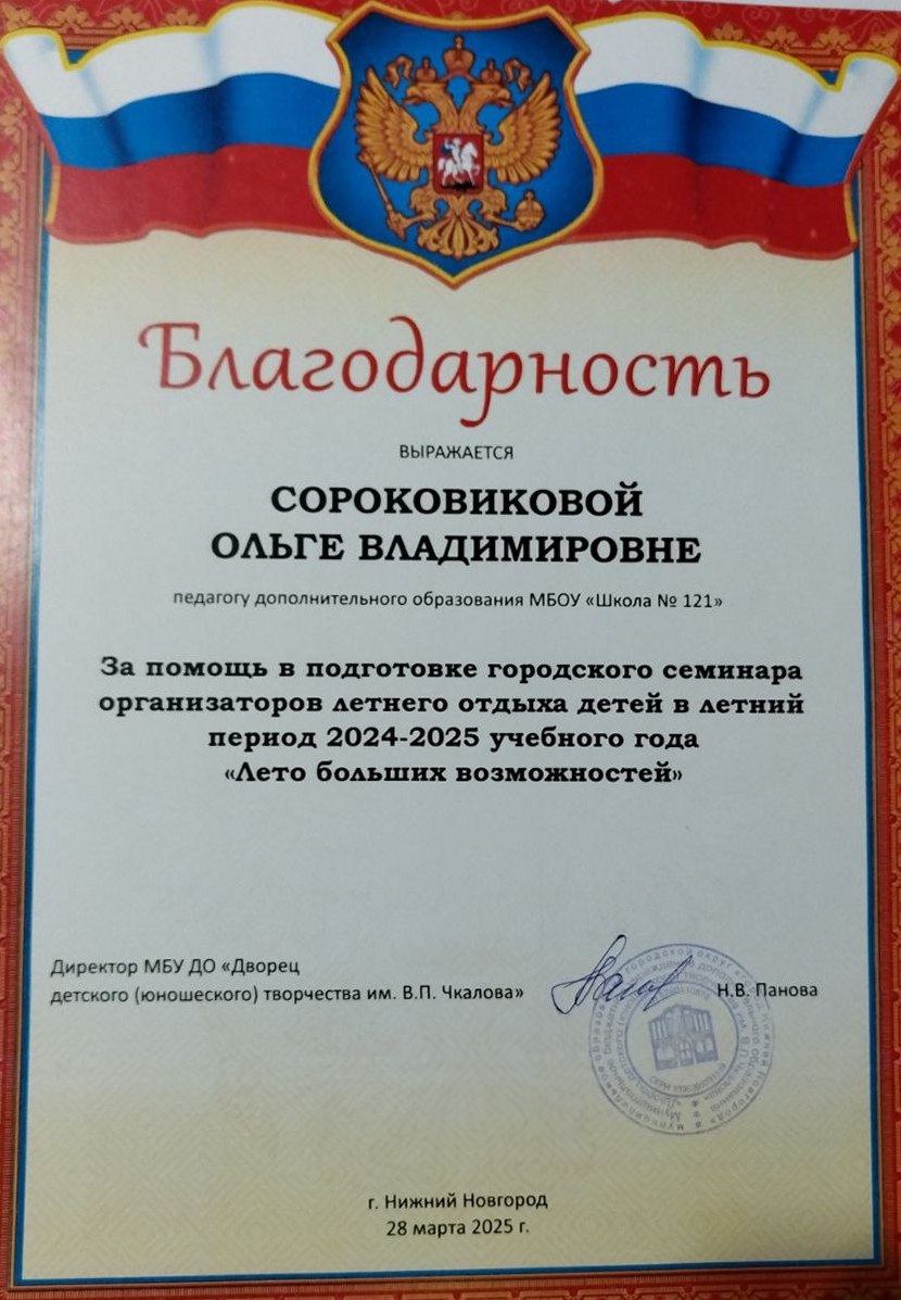 2025 Награждена благодарностью директора МБУ ДО «Дворец детского (юношеского) творчества им. В.П. Чкалова» «за помощь в подготовке городского семинара организаторов летнего отдыха детей в летний период 2024—2025 учебного года «Лето больших возможностей»