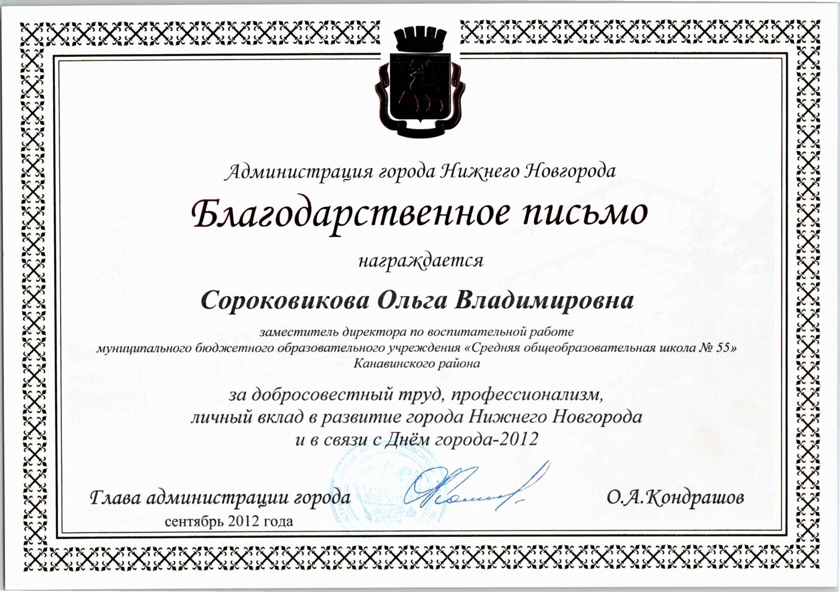2012 Награждена благодарственным письмом администрации города Нижнего Новгорода «за добросовестный труд, профессионализм, личный вклад в развитие города Нижнего Новгорода и в связи с Днём города - 2012»