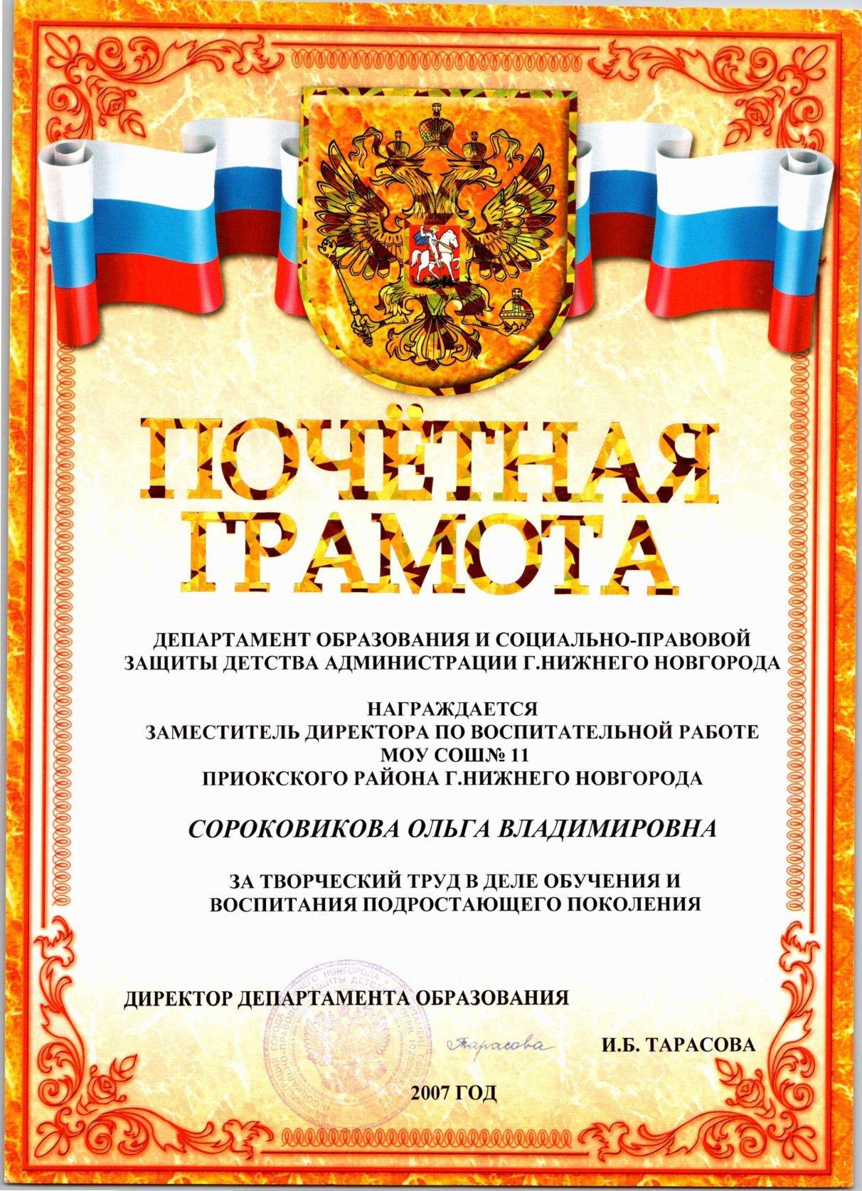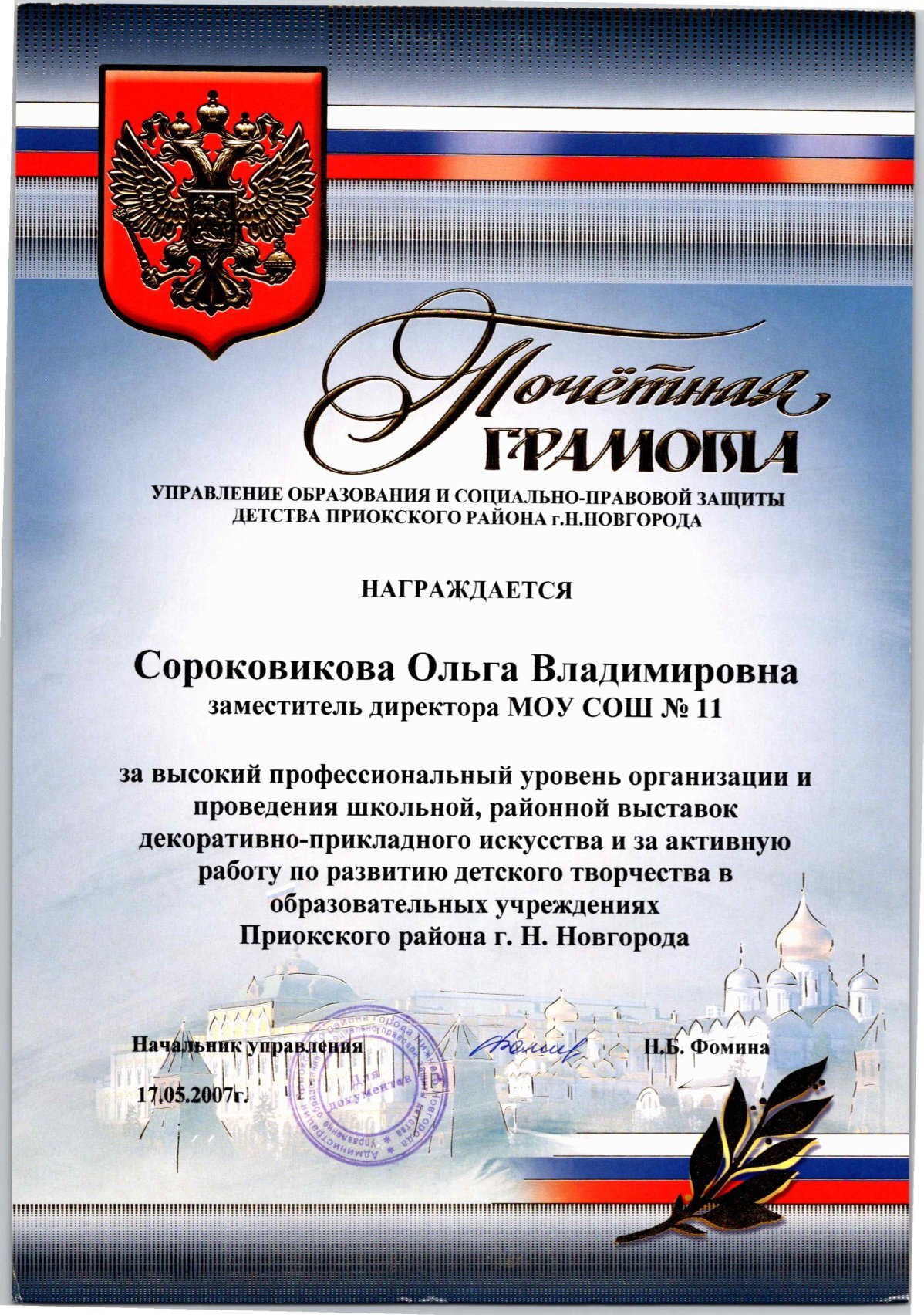 2007 Награждена почётной грамотой департамента образования и социально-правовой защиты детства администрации г. Нижнего Новгорода «за творческий труд в деле обучения и воспитания подрастающего поколения»