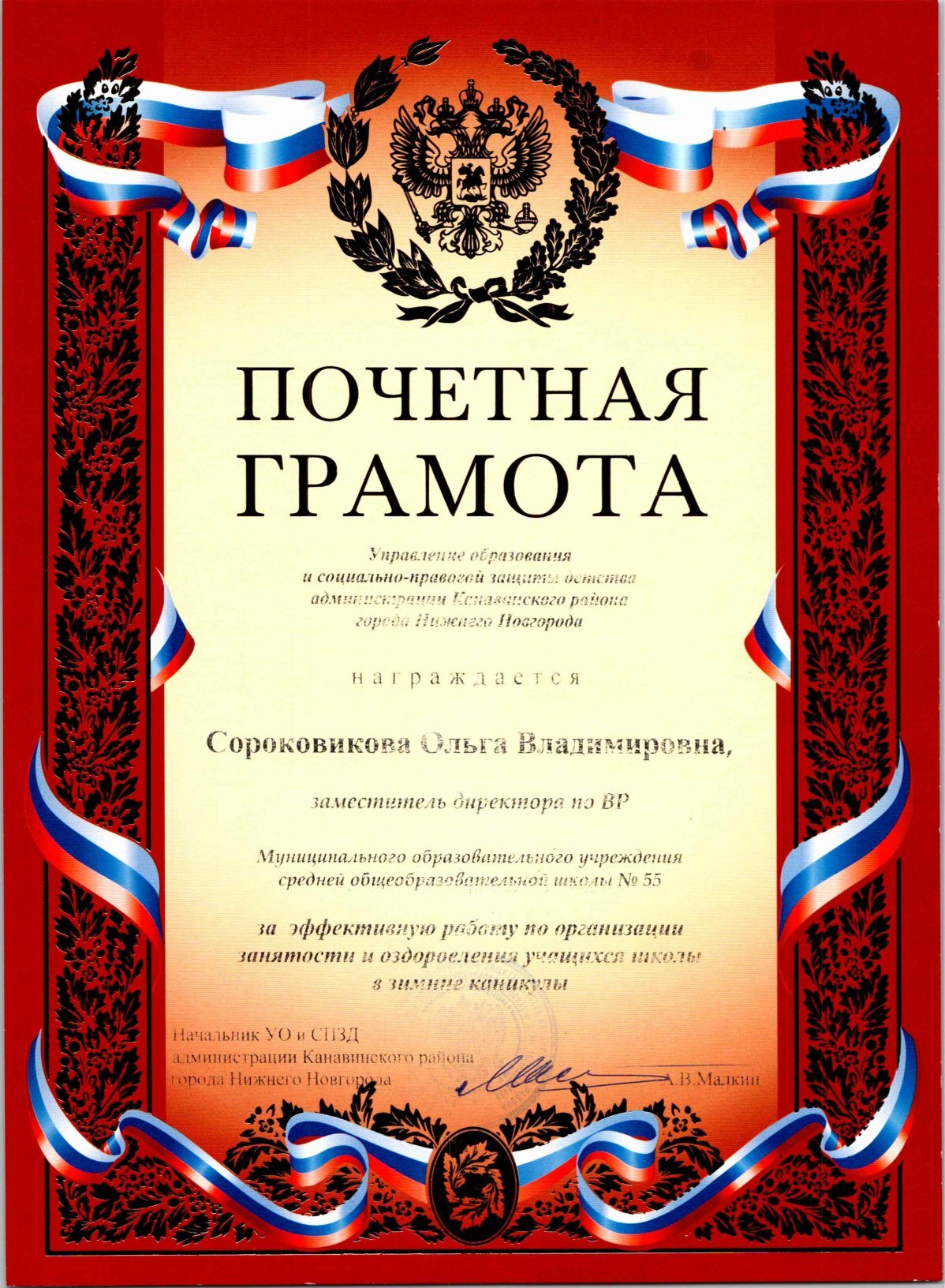 2011 Награждена почётной грамотой управления образования и социально-правовой защиты детства администрации Канавинского района города Нижнего Новгорода «за эффективную работу по организации занятости и оздоровления учащихся школы в зимние каникулы»