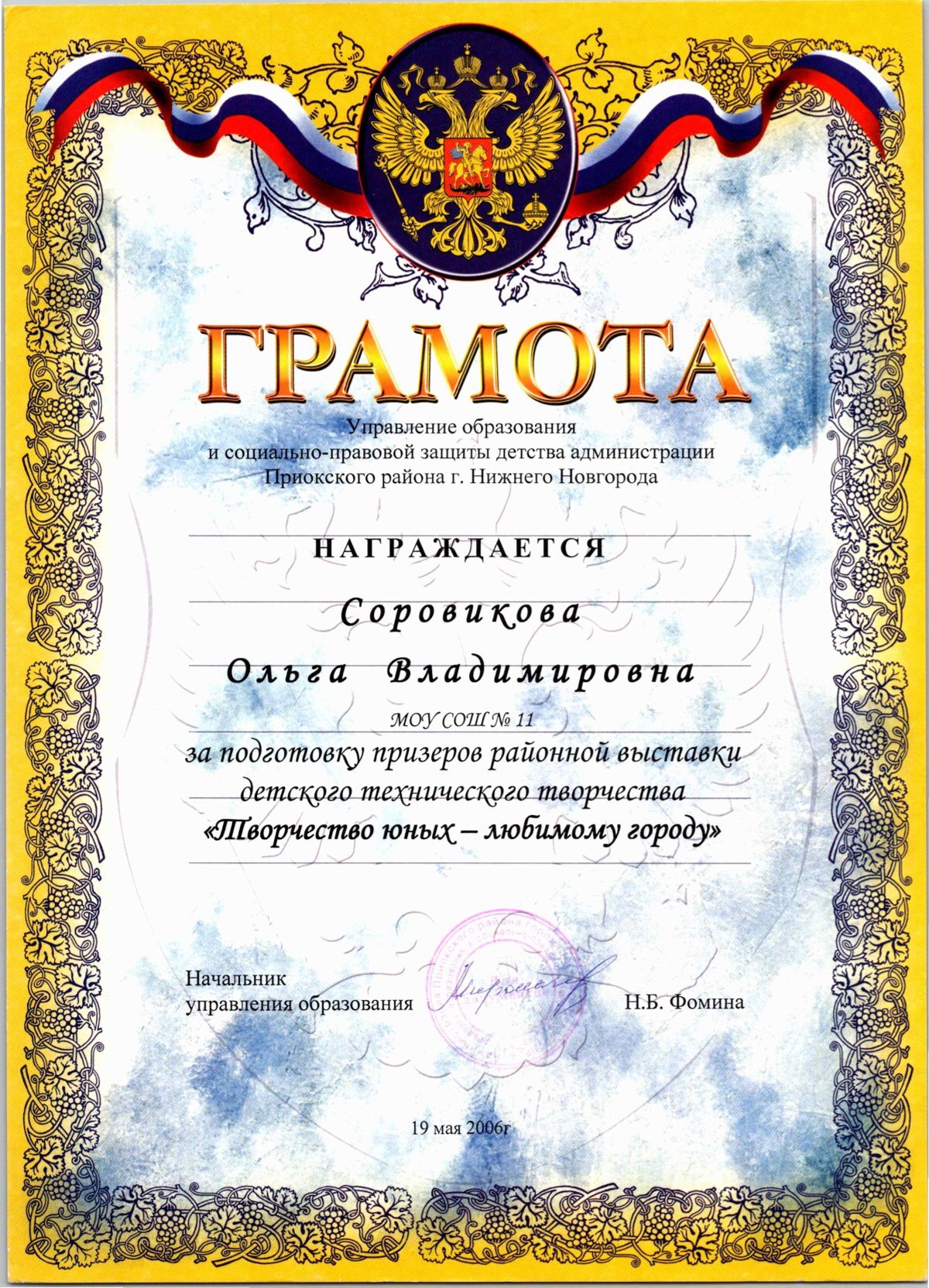 2006 Награждена грамотой управления образования и социально-правовой защиты детства администрации Приокского района г. Нижнего Новгорода «за подготовку призёров районной выставки детского технического творчества «Творчество юных – любимому городу»
